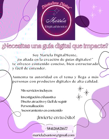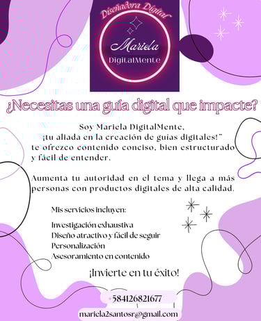 Con Mariela Digitalmente, transformara tus ideas en guías electrónicas, recetarios y más. Tu éxito es mi misión, ofreciendo servicios de marketing y diseño web personalizados.